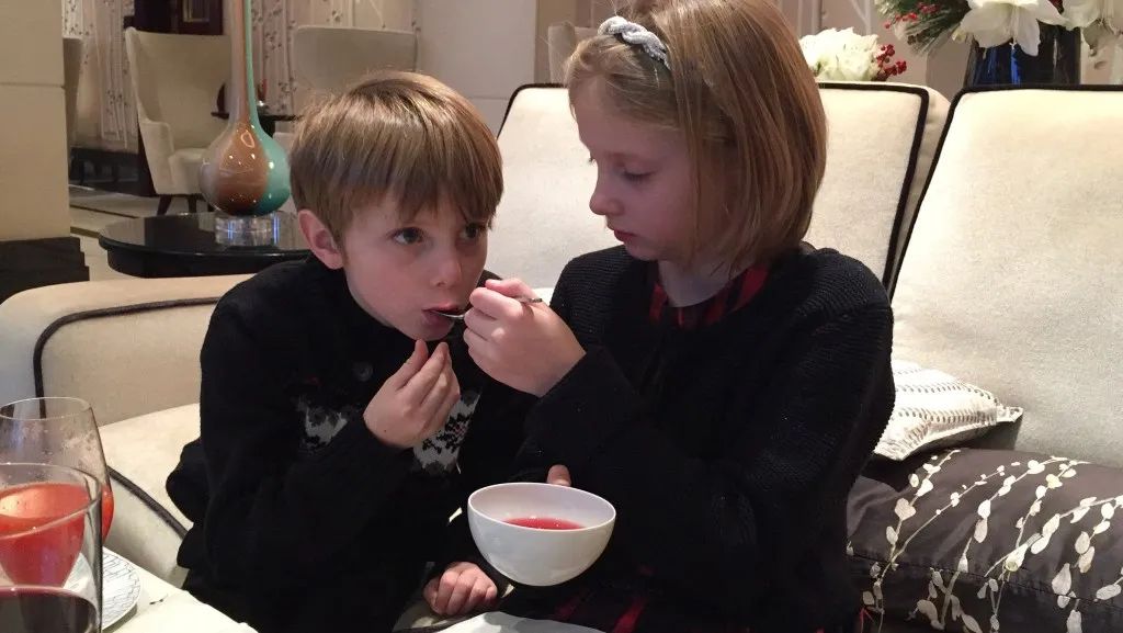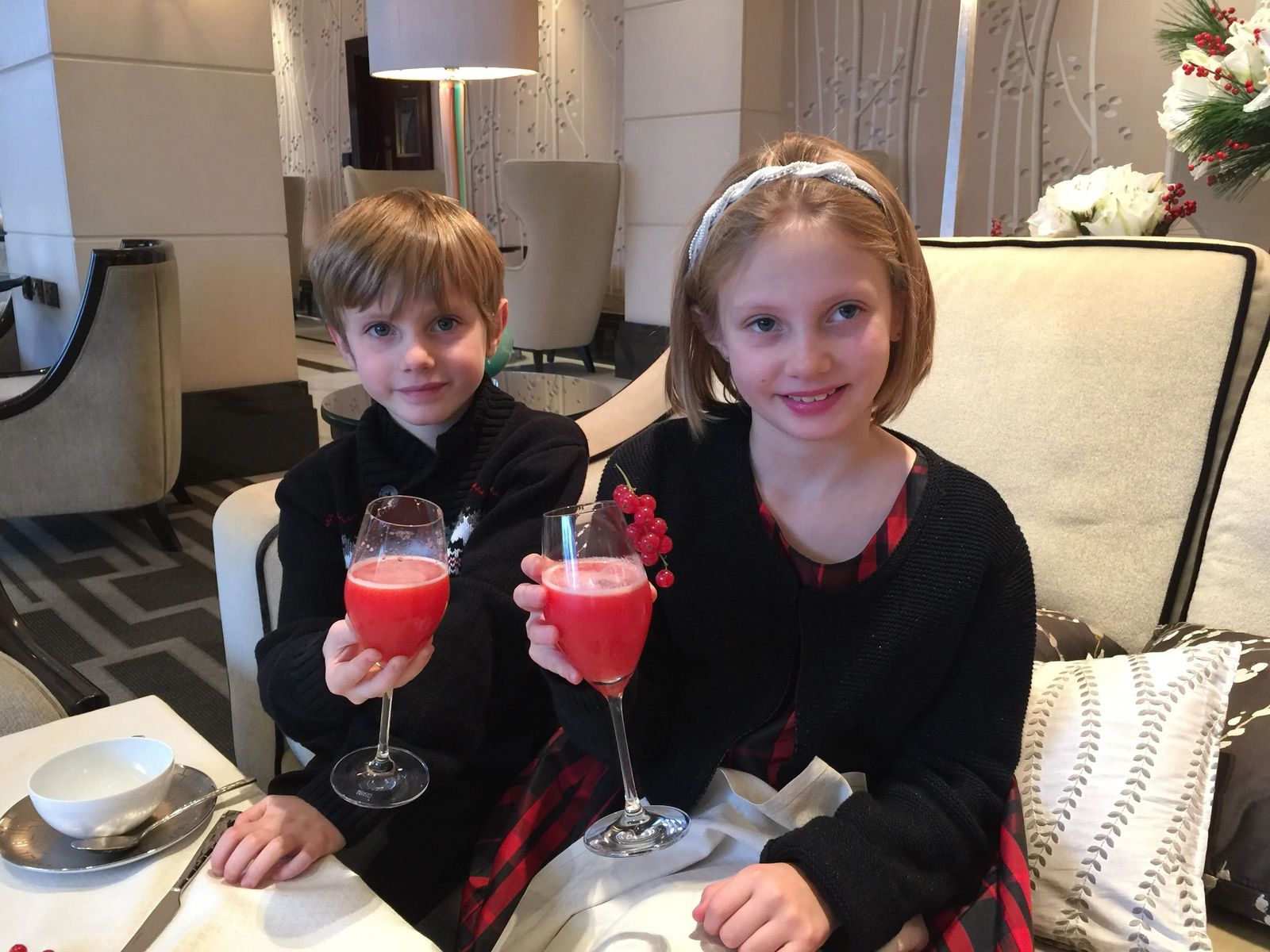 Christmas Unwrapped Afternoon Tea is an epicurean journey through traditional holiday fare with artfully prepared decadent sandwiches, scones and of course tea. I began with a special Champagne Cocktail which was whiskey, champagne and pear liquor garnished with an orange peel. The kids were given a pomegranate fizz mocktail embellished with a side of red berries. The Champagne Cocktail was a bit too strong for my taste so I switched to straight-up champagne.