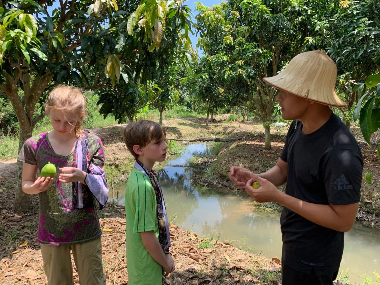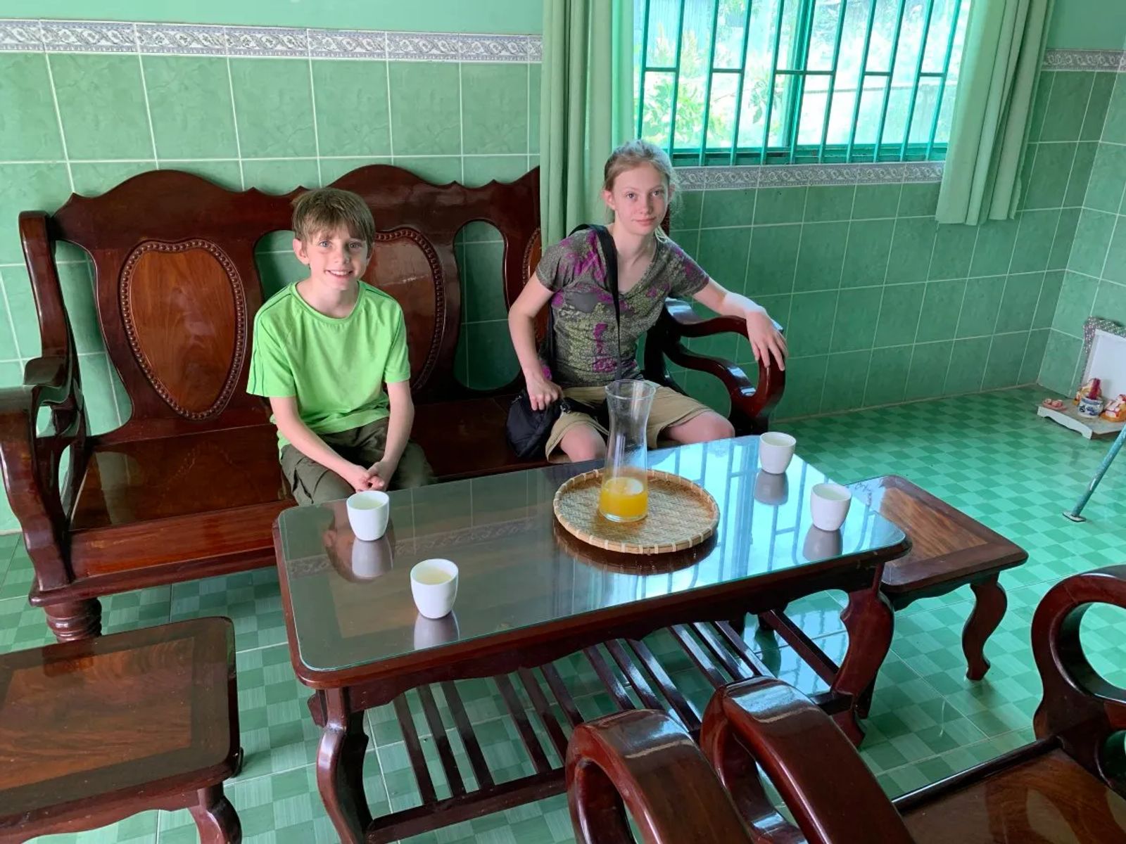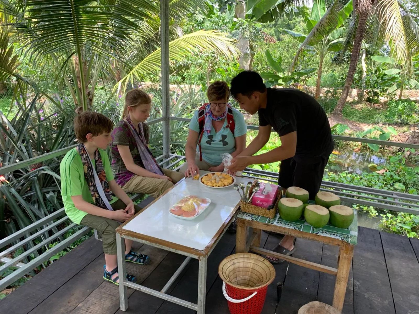 During our visit to Vietnam, I really wanted the kids to experience a family overnight and experience rural life. Through the site WithLocals.com, I stumbled across an overnight in the in the Mekong Delta with Son in his village of Lai Vung. We kept our apartment in HCMC and just brought an overnight bag for this adventure. On the day of our visit, Son picked us up promptly at 9:00 am and we began the 3.5 hour journey south into the Mekong Delta region. Son was very animated and excited to show us his village as he is a blossoming entrepreneur in the hospitality business. When we arrived, we were welcomed in his home with lovely fresh drinks and shown to our room with 4 beds. Son lives with his parents and his mother was busy cooking and preparing our lunch when we arrived.