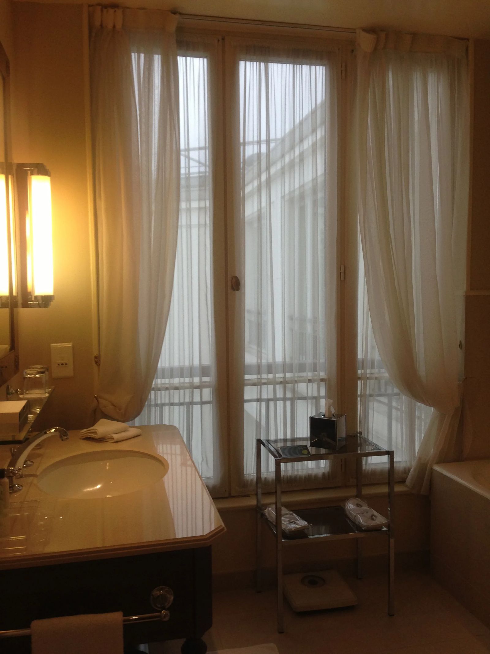 After an hour of resting in the lounge, our room was ready. As a Platnium Ambassador we were upgraded to a lovely Junior Suite featuring 2-double size beds (very comfortable!). Perfect for our family of four. Although the room only had a courtyard view, the room was spacious and absolutely perfect. Decorated in Napoleaon III style, the Junior Suite at 441 sqft had a separate seating area with a coffee table and couch. Two large windows faced an inner courtyard and the suite had a large, upscale bathroom. The bathroom also had a large window, separate waterfall shower, large tub and plenty of lighting that is always appreciated! Unfortunately I didn’t get photos of the Junior Suite, but I have some of the Executive Suite…call me tired this go-around.