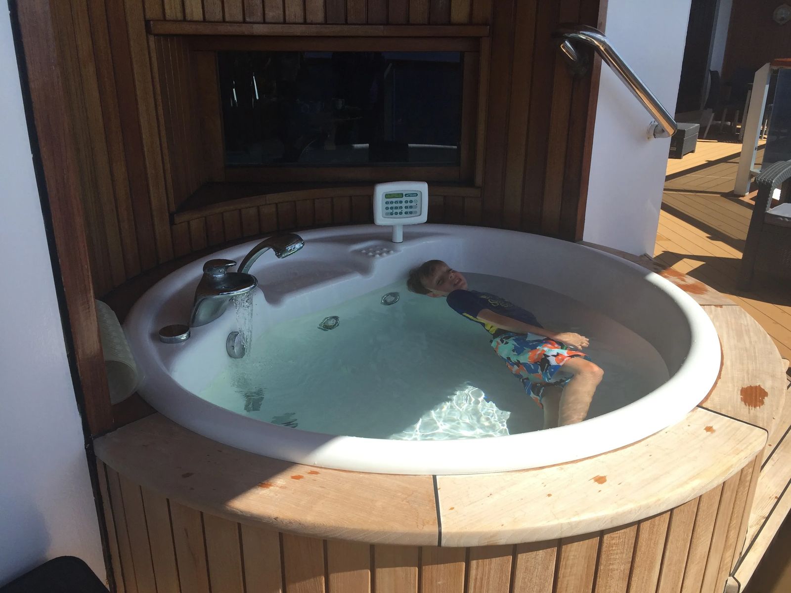 The verandah was absolutely amazing and a beautiful extension of the suite. Lined with teak wood, there was plenty of seating for all of us and offered amazing views of glaciers and the shoreline. The best feature was a 2-person hot tub that definitely got a lot of use! It was a bit smaller than I hoped but I am not complaining. It was divine to sit in it with a glass of wine as we circled Glacier Bay on a glorious sunny afternoon. Best.day.ever