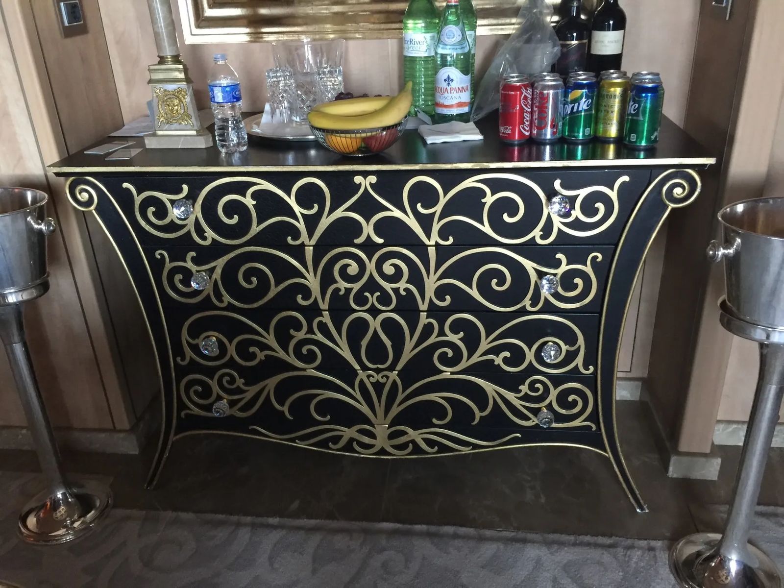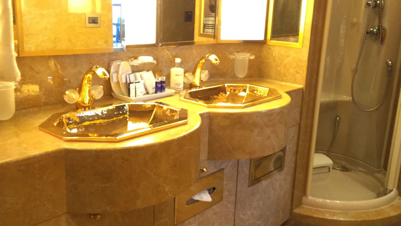 The master bedroom featured a high quality king bed that snuggled us in every night and 2 large doors shut off the master bedroom from the rest of the suite. The bedroom was huge! It also had large windows strategically placed so you could view the outside while lying in bed. It was so nice waking up to an ocean view every morning! A large TV was mounted over a large desk and there was a ton of cabinet space as well. Both TV’s had DVD players and offered complimentary DVD’s to check out at any time. The room also featured a large vanity with plug-ins and rare artwork doted the walls. This master bathroom, although somewhat gaudy with all its bling, is more luxurious than my bedroom at home!