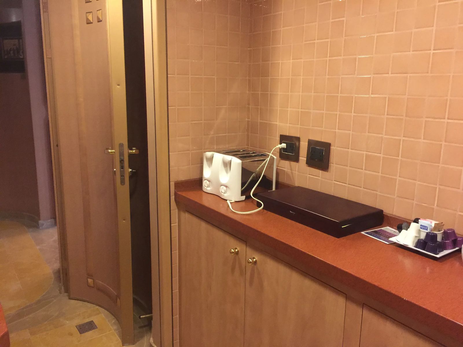 The living room was located off the dining room to the right and had plenty of seating for all of us. Artwork was displayed on the walls. The furniture, although a bit dated was comfortable enough. There was an impressive entertainment system with Bose speakers. I am quite tech savvy and so are my kids, but this system was definitely perplexing and we did have to call concierge a couple times to help get it working correctly. The suite actually featured a large binder on how to work everything! Between all the lighting, electric curtains and elaborate sound system it was a bit overwhelming. A very comfortable 2-person murphy bed was expertly tucked into the entertainment center and was made up every night for us. I wasn’t sure how comfortable this bed would be but it is a real mattress and my 85-year old mother-in-law found it perfectly suitable. There are plug-ins near the murphy bed for charging cell phones.