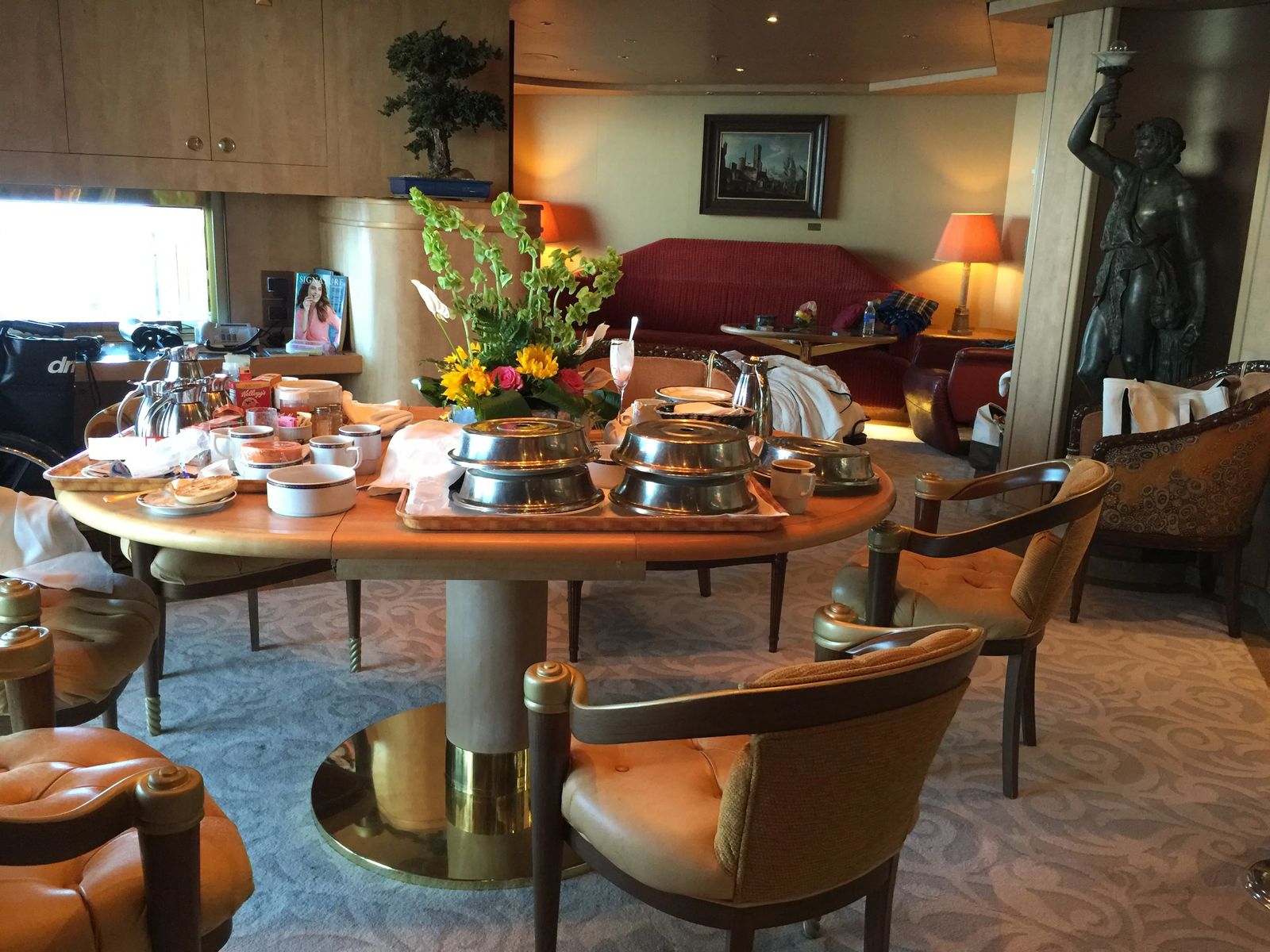 Other perks of the Pinnacle and Neptune Suites were complimentary laundry and dry cleaning, oversize bath towels, corsages and boutonnieres for formal night, hors d’oeuvres before dinner, binoculars and umbrellas for use on the cruise, priority boarding, priority dining and seating requests, daily breakfast service, and high tea service in-suite. We took advantage of it all!