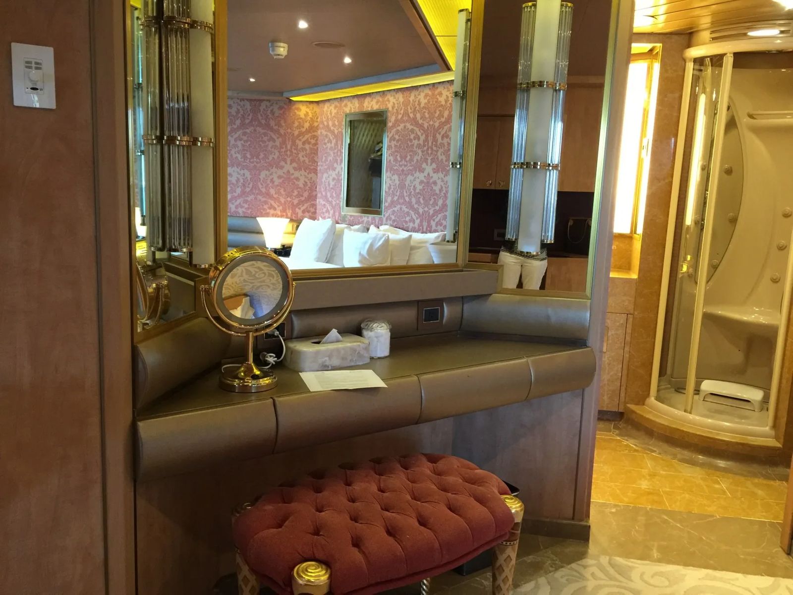 The master bathroom included 2-bathrobes and Elemis bath amenities (that never were replaced during our cruise) and a hairdryer. The one thing that bothered me was the bathrobes were for tall/large people. I am 5’1″. The bathrobe was so big it was a joke. I called and asked for a smaller one only to be told the only size available was a Large. Also, since they know exactly who would be in the room and ages of the occupants, you would think a robe would be provided for everyone. No. I had to call and ask to get a robe for my mother-in-law. I know this all sounds trivial, but when you spend this kind of money for the top-of-the-line suite, the little things make a huge difference. I wanted a robe to wear to the pool or on our verandah. Because it was so large, it dragged all over the floor and soaked up all the deck water. In the end, the staff came through and actually had their tailors custom fit a robe for me! The did admit it was a problem that robes were only one size.
